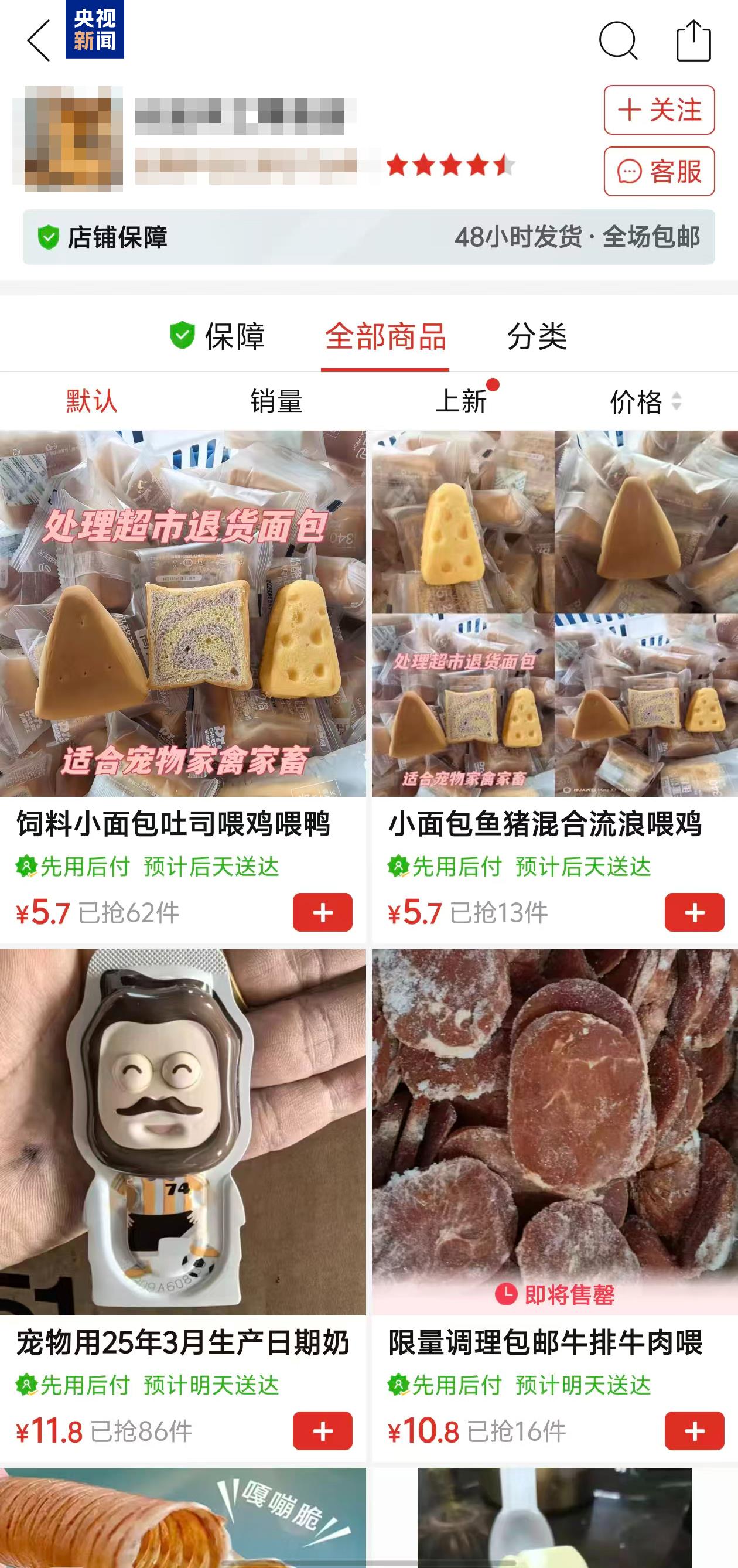 正在某电商平台一家店肆内,这里售卖各类动物饲料、“平替”面包、糕点以及超市下架的各品牌进口饼干等等。记者设法联系上了该店肆的担任人,一位名叫“春风”的商家正在德律风中引见,他们批发售卖各类过时食物,包罗面包、腊肠、烧鸡、零食等等,把这些过时食物当做宠物食物卖,仅仅是此中的很小一部门。
